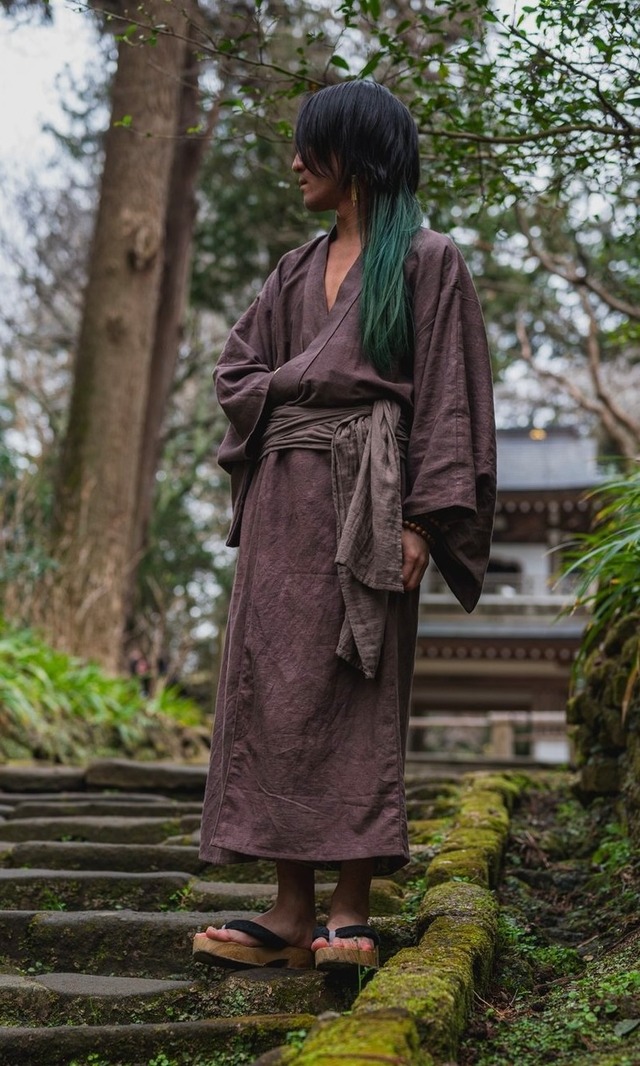 着流しつなぎ 着物でありながらもつなぎとして着ることができる着物 着付けいらずで打ち合いの中がパンツ使用になっているため、 裾や股がはだける心配もなく男性も女性も気軽に着ることができるユニセックス着物 着流しつなぎでは、座ったり、走ったり、階段を登るなど様々な日常の場面で着物では制限されてしまう動作を気にせず、ゆったりと着ることができます。 はいて、袖を通し、帯をしめるだけで簡単に着こなせるので日常でもカジュアルに着ていただけます。 生地は100%天然素材です。 色は天然染料で全て手染めをしております。 色はオーダーでご相談いただければ染色作業からできる限りご希望の色に仕上げます。 ビビッとくるものがありましたらぜひオーダーください。 こちらは受注生産になります オーダーから2ヶ月ほど制作にお時間を頂いております。 ご自宅でお洗濯する場合には必ず1〜2回は単体でお洗濯をしてください。 <サイズ> ・丈 約145cm <必読事項> この作品は受注生産となっており、写真と多少異なる箇所がある場合ざございますのでご了承ください。 この作品は全て手作業で仕上げています。 既製品のような出来栄えでない場合がございますのでよろしくお願いいたします。 気になる方はトラブル防止のため、ご購入をお控えください。 ノークレームノーリターンでお願いいたします。