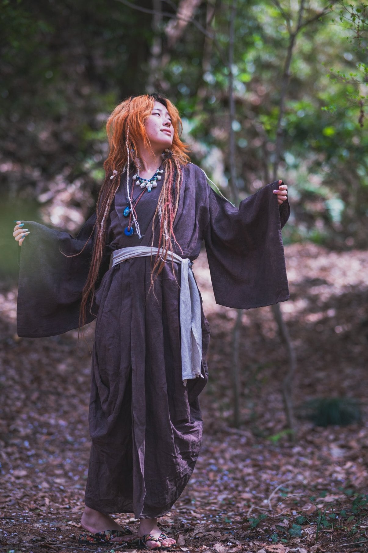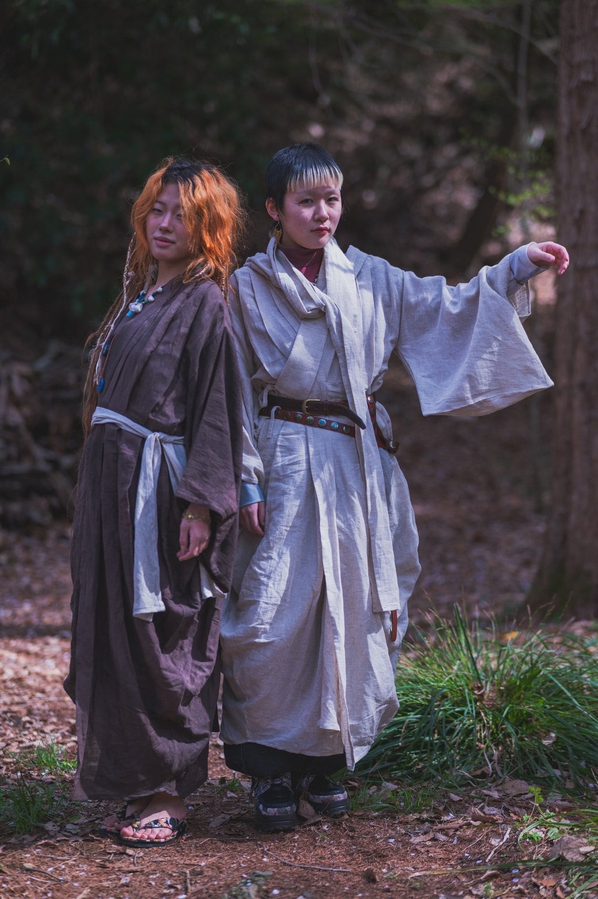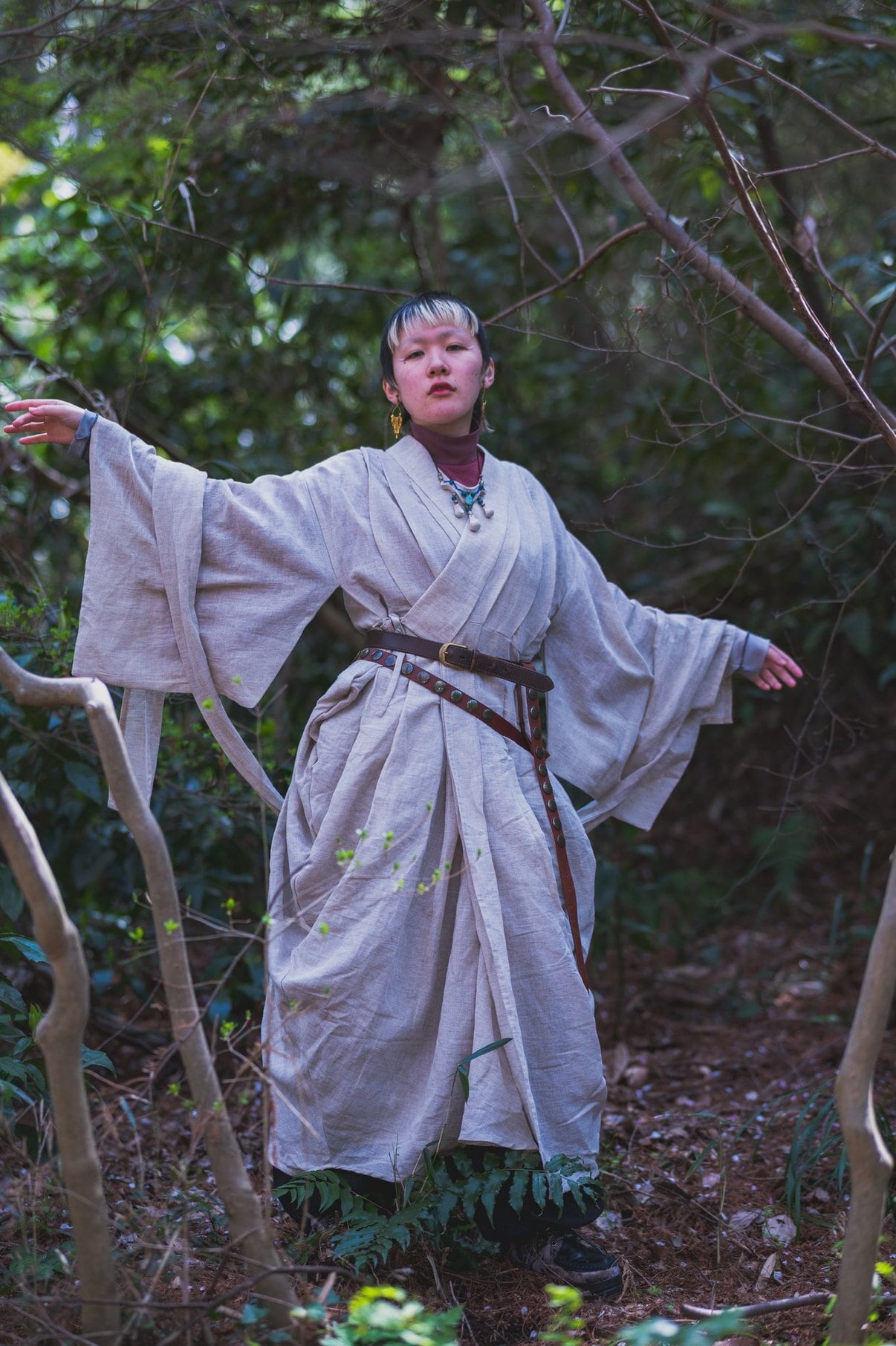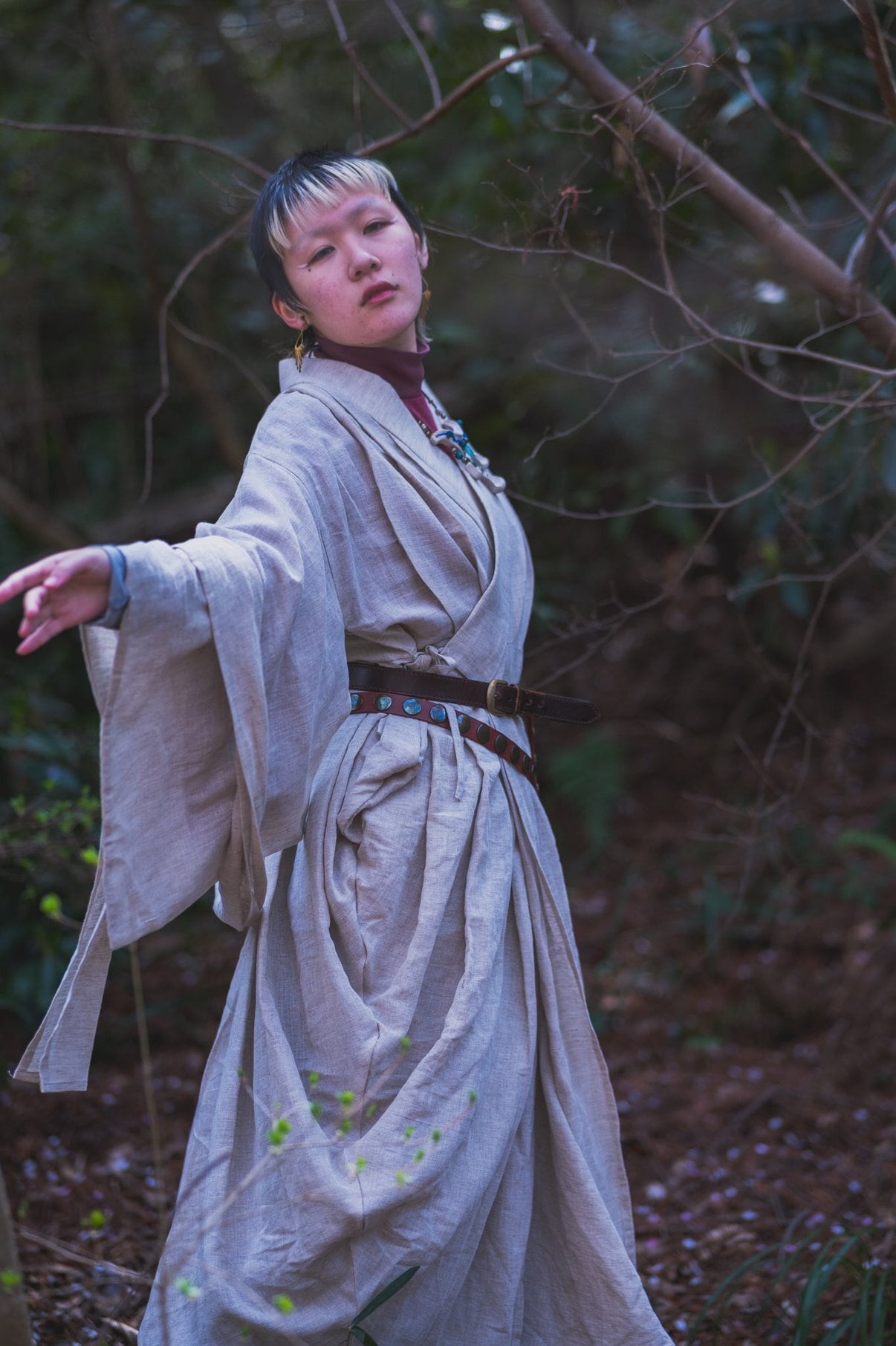 直線を基調とする着物にたっぷりと加えたドレープはゆらめき、たなびき、女性らしい輪郭を描きます。