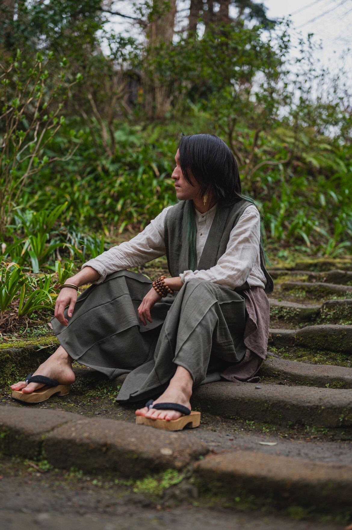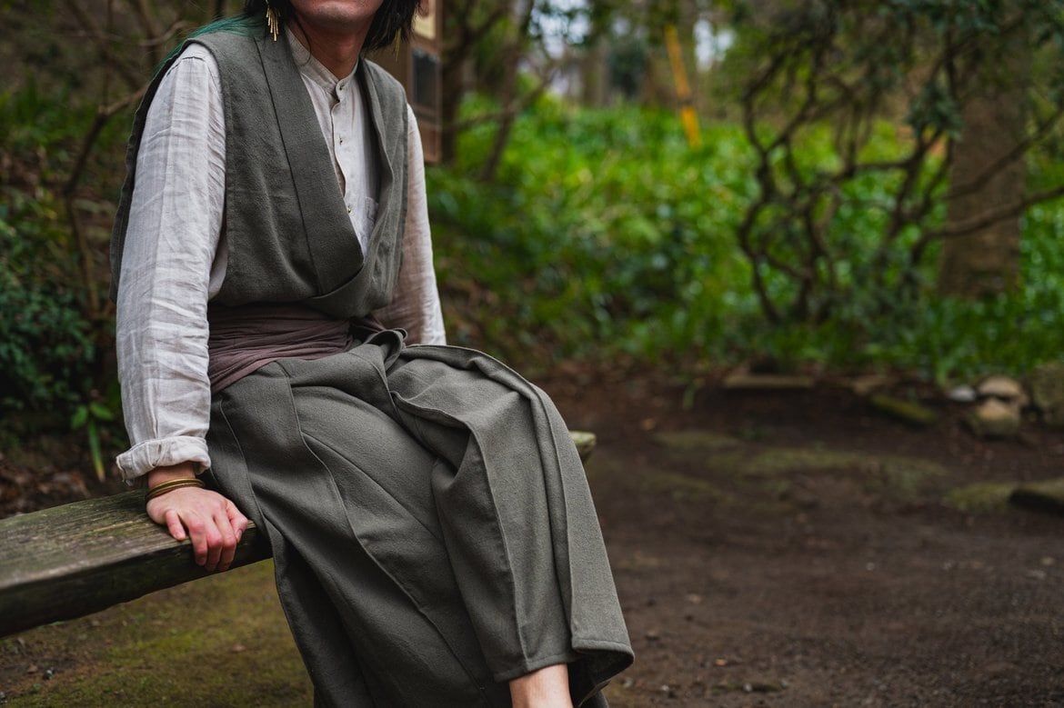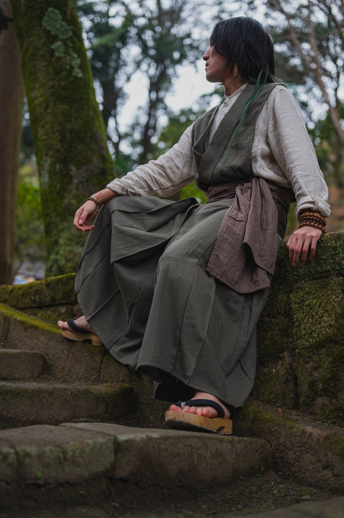 生地をたっぷりと贅沢に使った袴は動作とともに揺らぎ、それは日本の自然を象徴するかのよう。